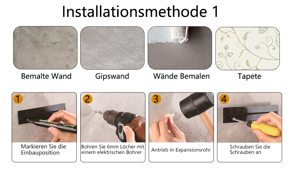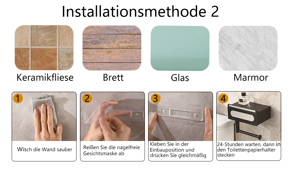 【Zwei Installationsmethoden】Der SUNZOS Klopapierhalter ist mit zwei großen Klebebändern ausgestattet, um Stabilität während der Installation zu gewährleisten. (Das zweite Band ist ein Geschenk als Backup) Hinweis: Klebstoffinstallation eignet sich für glatte Oberflächen wie Keramikfliesenwände, Glas, Marmor und glattes Massivholz, außer für Gipswände, bemalte Wände und Tapeten. Schraubenmontage: Der Toilettenpapierhalter mit Regalen wird mit einem kompletten Installationszubehör geliefert. Sie können es an jeder Wand installieren, es ist sehr stabil. Sie können zwischen zwei Installationsmethoden wählen